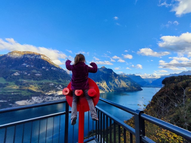 Vélo jusqu'à Klewenalp, Klewenstock, en passant par place de jeux, parcours dans les arbres, pic-nic, place de jeux, vélo et retour pour dodo à Beckenried.